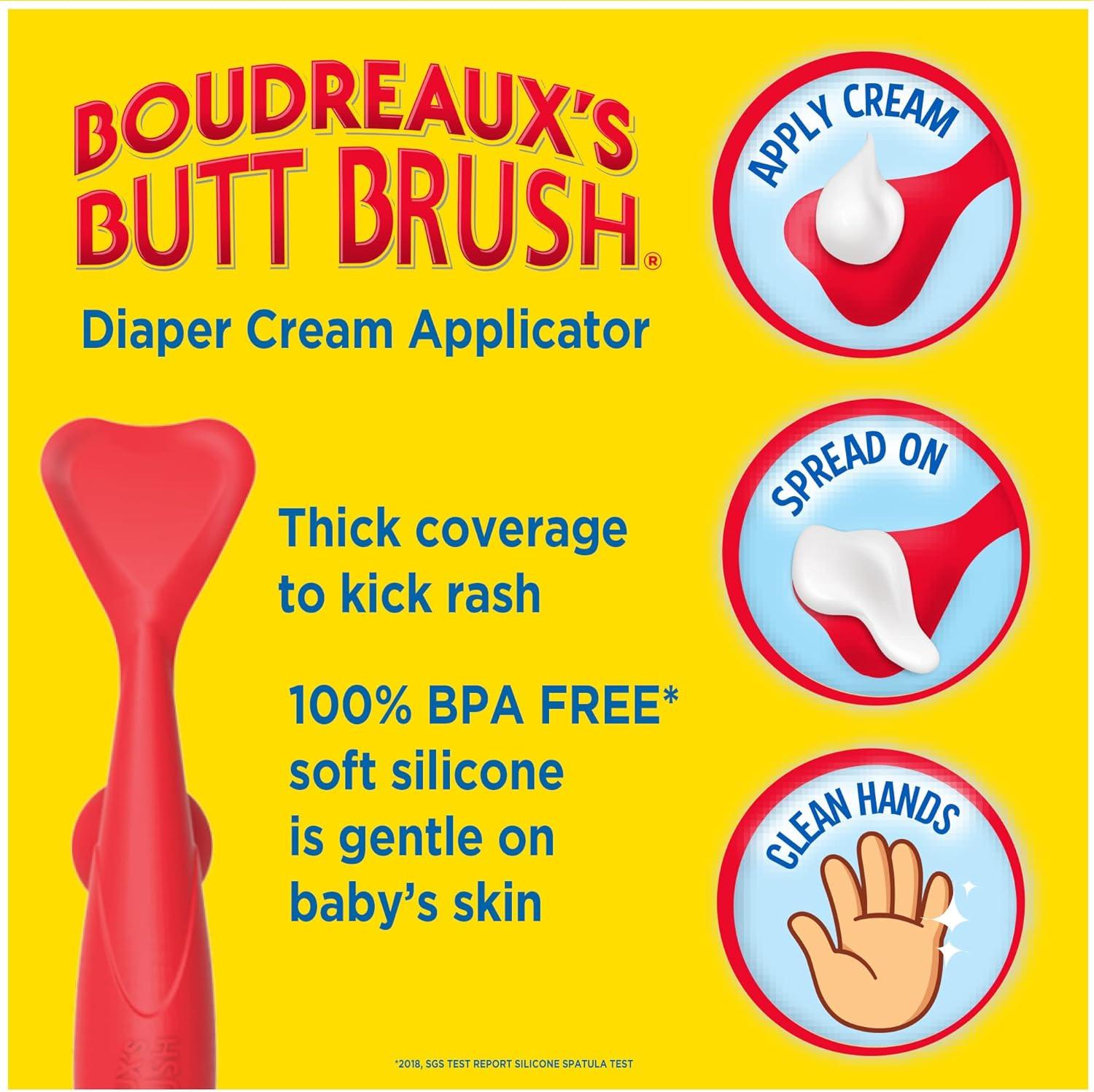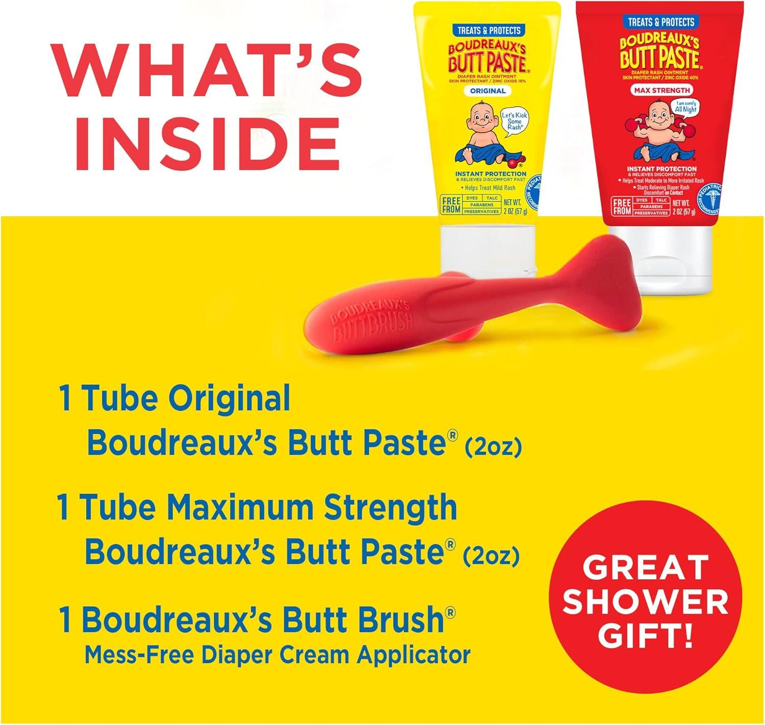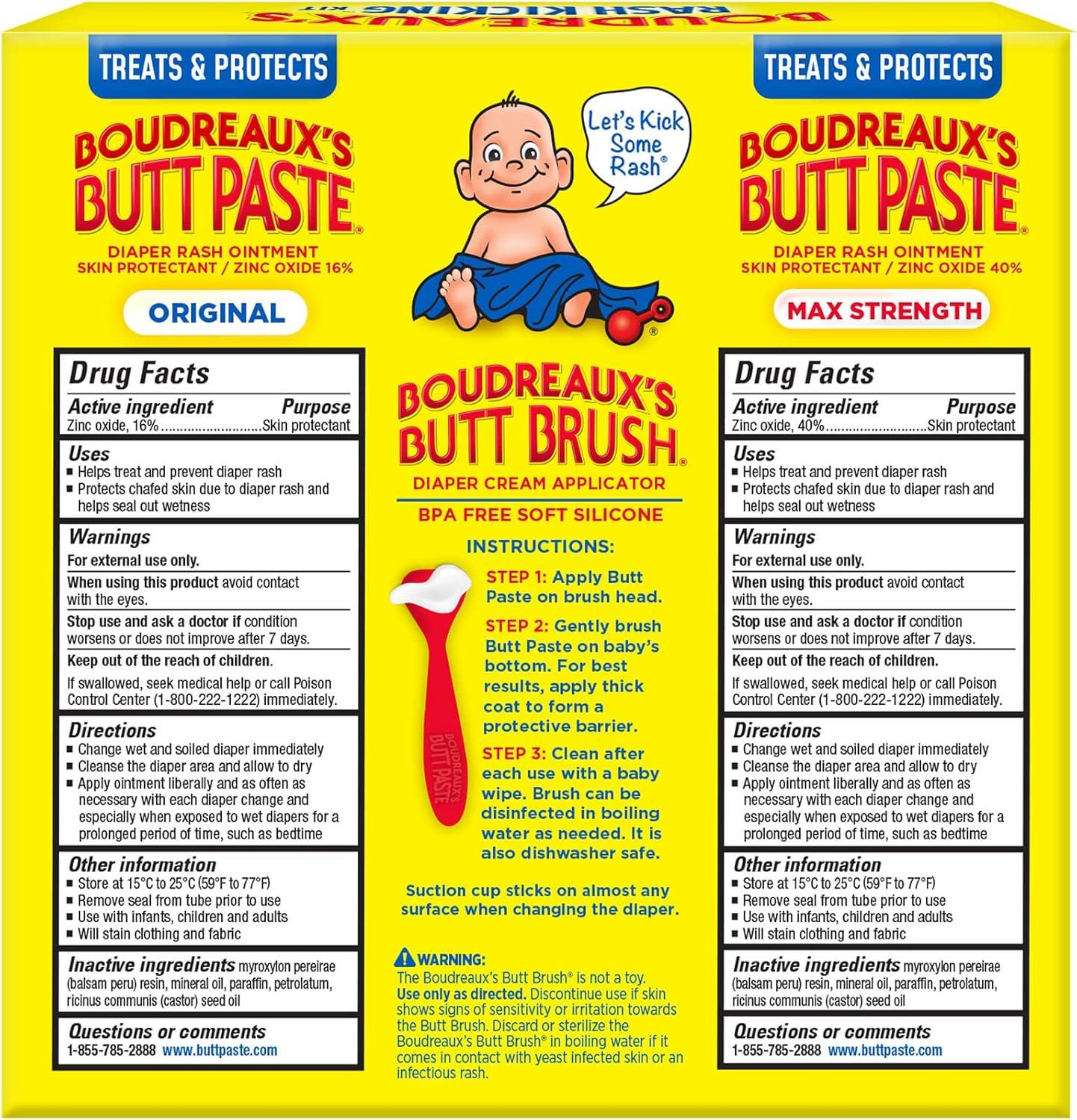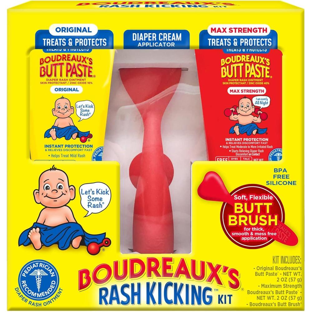 The combination of three Boudreaux’s Butt Paste products included in one Rash Kicking Kit makes for a great baby shower gift for any new parent. The mess-free applicator provides thick and smooth coverage to protect against diaper rash and to keep hands clean. Apply Butt Paste on the brush head and gently brush Butt Paste cream on baby's bottom. For best results, apply a thick coat to form a protective barrier. Clean after use with a baby wipe. The Butt Brush can be disinfected in boiling water as needed. It is also dishwasher safe. Boudreaux's Butt Paste Diaper Rash Maximum Strength and Original Formula ointments are clinically tested, safe and effective formulas that help relieve discomfort in one use and provide long-lasting, overnight protection. Boudreaux's Butt Paste Diaper Rash Ointments are free from dyes, preservatives, parabens and talc. When used daily, it is also a great way to help prevent diaper rash. Boudreaux’s Butt Paste has diaper ointments for any baby’s boo-tay needs including maximum strength, sensitive, natural* aloe, and butt barrier. Boudreaux's Butt Paste products are FSA- and HSA-eligible in the U.S. *Other ingredients may not be natural. Natural refers to the source of listed ingredients and allows for only minimal, non-chemical processing of these ingredients .
